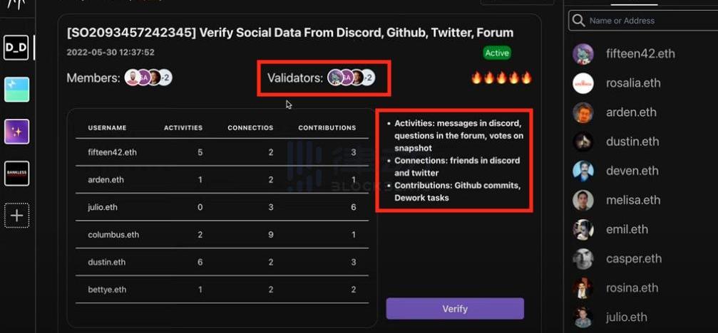 点击进入任意一条数据集后则可以为DAO成员的数据进行验证。DAOU将DAO成员的数据分为三类:Activities,参与社区活动或发言的次数、Connections,社区内的朋友数量、Contributions,Github代码贡献或Dework完成任务数量。在这个页面我们还能看到已为该数据提供验证的DAO成员,以及各成员的数据评分。