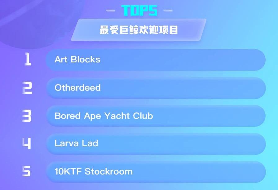 最受巨鲸欢迎项目排前五的分别是:ArtBlocks、Otherdeed、BoredApeYachtClub、LarvaLad和10KTFStockroom。