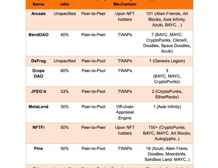 与可能永远不会被接受的“bid-and-ask”贷款不同,P2Pool更像是“让市场决定”:集中贷方提供的流动资金,根据各方的供需情况,分摊借款人支付的利息。如果借款人无法偿还贷款,或价格下跌导致NFT抵押品面临清算,协议将拍卖NFT,所得款项将返还给借款人。通过P2Pool,借款人可获得的资金量将大大增加,同时,借款人可以立刻获得流动资金,无需贷方确认条款。然而,这也意味着他们需要依靠预言机的价格信息生成贷款条款。由于长尾NFT资产对价格操纵更为敏感,该方法仅适用于主流NFT。例如:JPEG’d,DeFrag,BendDao,MetaLend,Pine,DropsDAO为便于比较,在评估NFT借贷协议时,我列出了一个表格,其中囊括了一些重要指标。有的协议会设置贷款价值比上限以减少违约的可能性,而对于流动性和需求更大的NFT,LTV比率通常会更高。由于P2P协议的覆盖面比大多数P2Pool协议更广,两种借贷方式支持的NFT收藏品差异很大。值得注意的是,大多数协议在调整定价机制和LTV比率的同时,也在不断扩大其支持的收藏品。