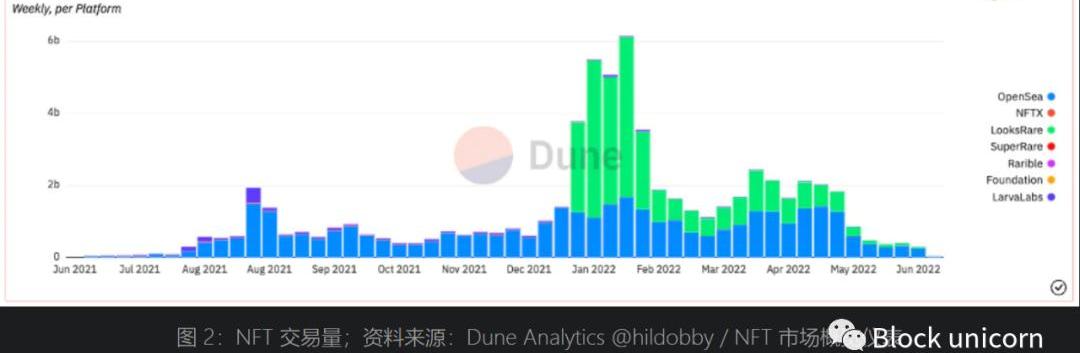 如果只看NFTFi(NFT信贷市场的行业领导者)发放的贷款,2021年贷款规模超过4000万美元,2022年1月至2022年5月的累计贷款规模达到1.55亿美元。2022年5月NFT交易额30亿美元(见图2),NFTFi同月发放3600万美元贷款,NFT信贷市场渗透率略高于1%。
