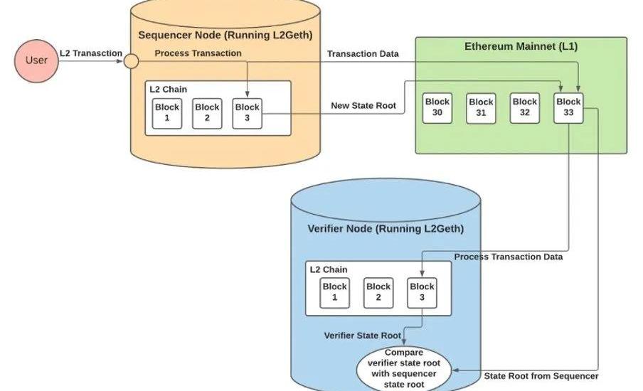 用户在Arbitrum提交交易,Arbitrum的sequencer对交易进行执行,分批次将状态根与交易数据完整提交到以太坊主网上的智能合约中.