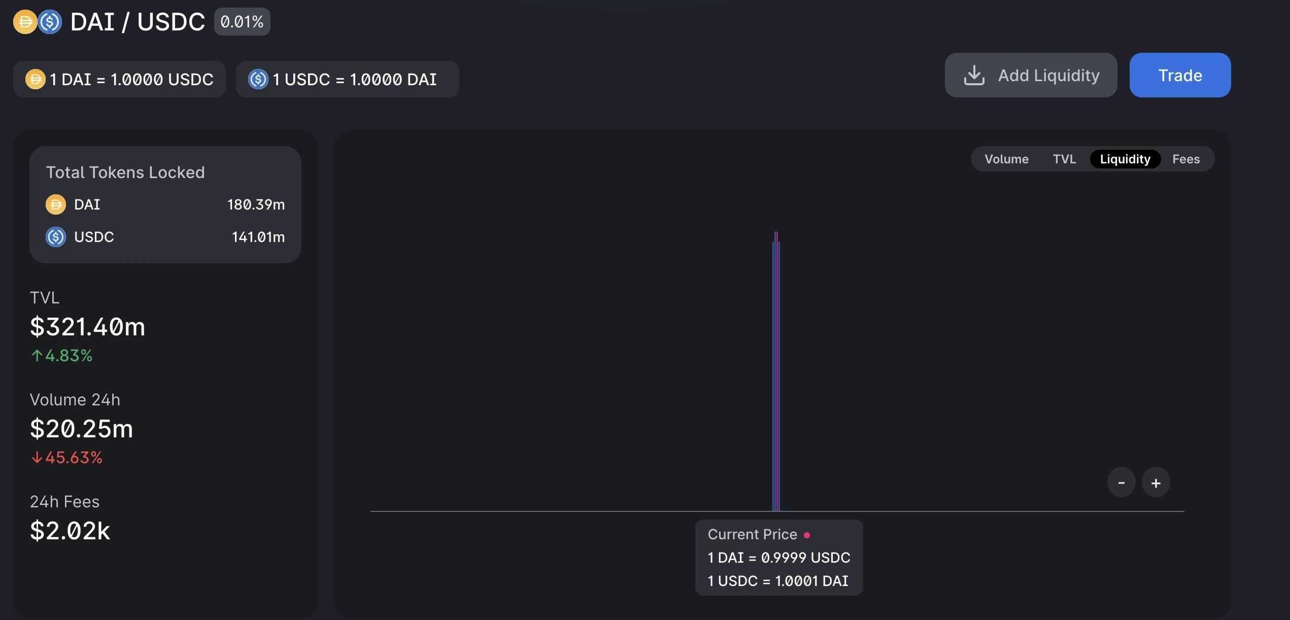虽然其中大部分的交易量都来自于非稳定资产,但是由于UniswapV3集中流动性AMM的创新设计,稳定币交易对的流动性提供者可以把流动性集中提供在1的附近,比如DAI/USDC交易对流动性集中在价值区间内,这样相比于传统的AMM极大的降低了稳定币资产在交易中产生的滑点,因此也为稳定资产的交易提供了一个Curve之外的选项。