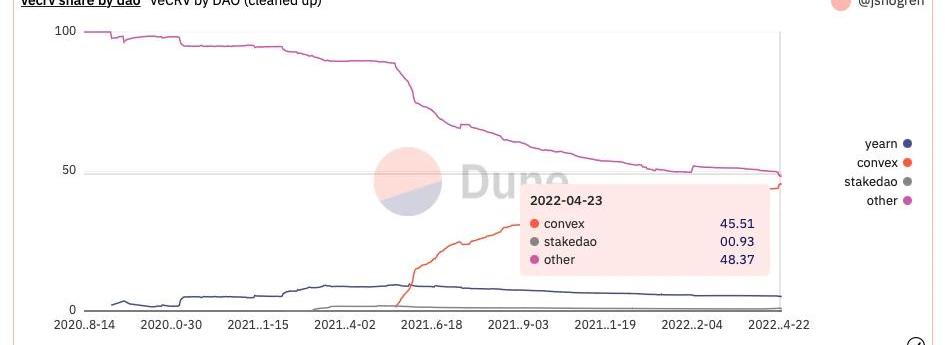 Convex是现在最主流的DeFi项目在争夺CurveWar主导权的竞争平台,因为上一部分中提及的,Curve层面的竞争最大成本在于需要把CRV锁仓四年才能获得最多的veCRV,四年后的解锁在DeFi的领域里实在是过于遥远。而Convex可以很好的解决这个问题,因为用户在把CRV抵押给Convex平台后会受到1:1生成的cvxCRV代币,其可以再市场中自由的流通,并且由于其在Curve平台上充足的流动性,cvxCRV与CRV代币的价格达成了很好的1:1锚定,所以为cvxCRV的持有者增加了一个流动性很好的退出渠道。因此Convex到目前为止积累了大量的CRV代币,其veCRV的持有量占据了veCRV总量的约45%。
