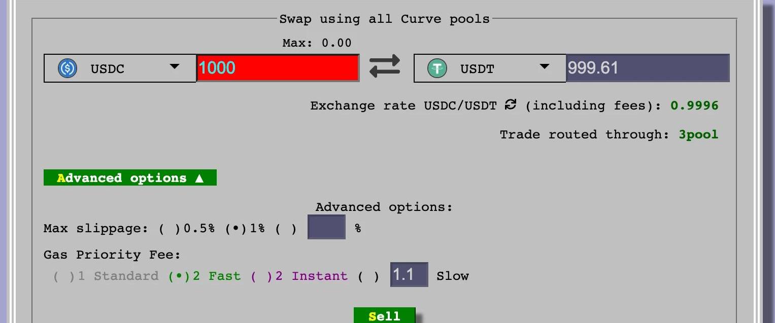 当前Curve3-pool中USDC+USDT的TVL为$1.95B美金,UniswapV3USDC/USDT交易池的TVL为$217.43M美金,前者约是后者的9倍。如果我们以当前的真实交易情况做对比,以分别代表巨鲸和散户单币交易份额的100,000美金和1,000美金USDC/USDT交易为例: