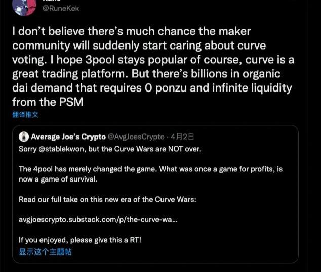 如果再考虑上MakerDAO自身的PSM机制,支持DAI与USDC的1:1兑换,正如MakerDAOcofounder@RuneKek所言,MakerDAO目前并不是很在意4Pool对其3Pool流动性的冲击。