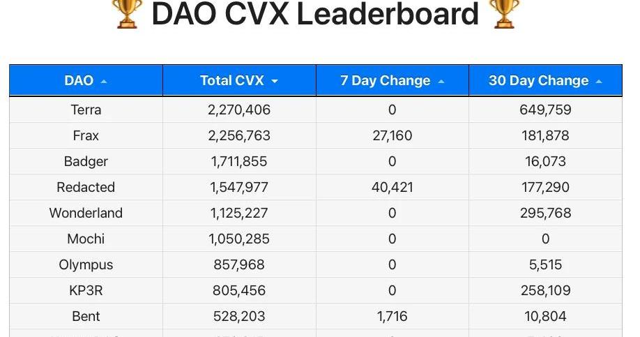 因此Terra和Frax等CurveWar的参与方目前主要的焦点都是在对Convex控制权的争夺上。我们也可以看到各类DeFi协议方都在不断积累自己控制的CVX数量,在锁仓获得vlCVX后通过投票引导Convex控制的底层veCRV的投票。但是假设以当前CVX市场价约$26计算,Terra和Frax控制的共计约4.56M个CVX对应的资金成本约为$118.55M。尽管二者已经牢牢占据了DAOCVX持有数量前二的位置,但是由于其控制总量只占到了CVX锁定量的约10%,还远远不足以达到控制Convex平台的目的。