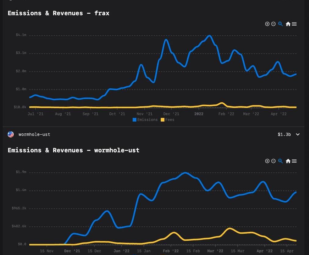 因此在Curve层面,项目方如果希望加入CurveWar争夺CRV流动性激励并达成增加自己项目代币对应资金池的流动性深度,那么需要他们在公开市场中购入CRV并锁仓得到veCRV从而直接参与CurveGaugeWeight的投票,增加对应资金池的预期收益,来吸引更多的流动性提供者和资金。并且根据下图中的数据,当前UST与FRAX在Curve上对应的资金池流动性提供者的主要受益来源都是$CRV平台代币的流动性挖矿奖励,其近期由交易产生的手续费受益甚至只有CRV奖励价值的2-10%。