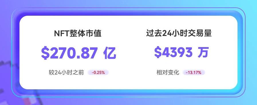 截至5月25日15时,NFT整体市值270.87亿美元,较24小时前下降0.25%;过去24小时内总交易量约4393万美元,日环比下降13.17%。