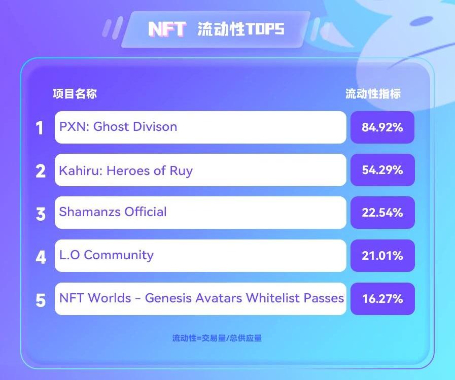 按过去24小时流动性指标,排名前五的项目分别为PXN:GhostDivison、Kahiru:HeroesofRuy、ShamanzsOfficial、L.OCommunity和NFTWorlds-GenesisAvatarsWhitelistPasses。