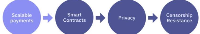 ZKRollup解决方案能够带来一些独特的优势,如隐私保护、保留可扩展性和跨链应用的实现。隐私是ZKRollup的优势与特点之一无许可区块链可以在不信任第三方的情况下实现计算完整性,但它们在可扩展性和隐私方面付出了代价。从1980年代开始,诸如零知识证明、交互式证明和概率可检查证明等证明系统的理论工作已经阐明了解决这两个问题的途径,并体现在实际应用中;保留可扩展性给予开发者理论上几乎无限的计算能力这使得将互联网上的生态都移植过来成为可能,如对战类的游戏以前在以太坊上很难实现,但ZKRollup可以改变这一点。此外,超强的计算能力再加上区块链的特性,还能够衍生出很多新的应用;另外就是跨链应用,ZKRollup的代表之一,StarkNet有非常多样化的桥接功能开发人员可以从L1向L2发送任何负载,即把dApp的头部部署在L2,在这里可以进行费用较低的治理或游戏操作,而向L1的流动性发送指令。就像将L2作为大脑,而L1作为肌肉;ZKRollup的痛点