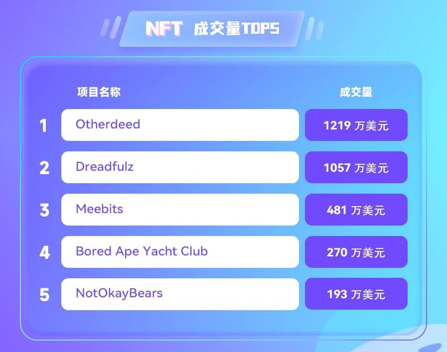 按过去24小时成交量,排名前五的项目分别为Otherdeed、Dreadfulz、Meebits、BoredApeYachtClub和NotOkayBears。