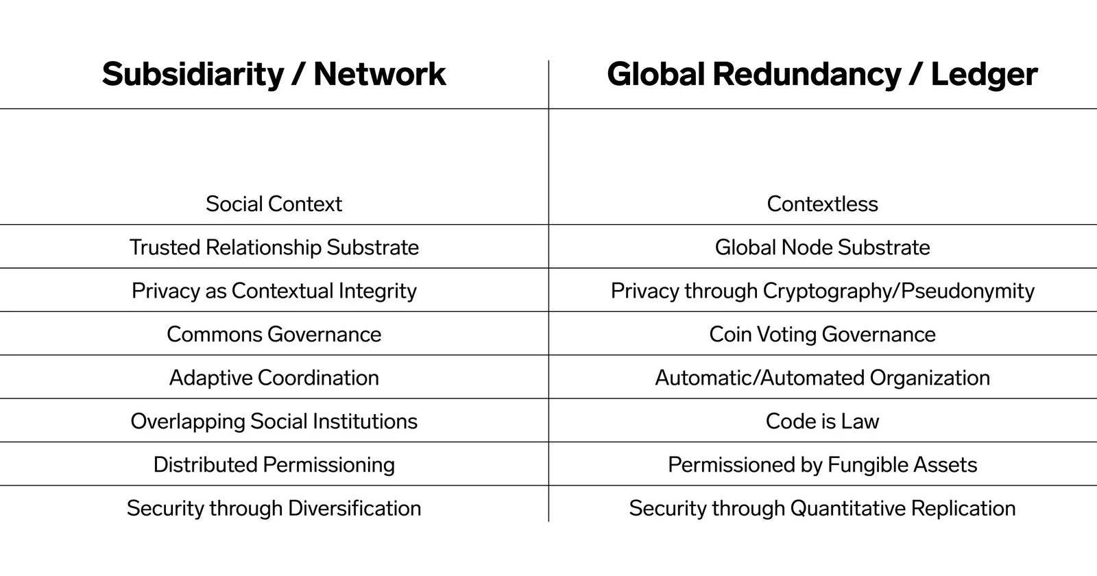 Web3的倡导者认为去中心化规模是空前的。过度的中心化会阻碍协调,削弱自由、民主和经济活力,去中心化是一种补救措施。但这个词本身过于模糊,无法成为最终目标。完成工作需要正确的去中心化,而我们担心Web3到目前为止正走在错误的轨道上。我们更担心去中心化的程度,而不是类型。关注去中心化的程度会导致Web3的倡导者错误地描述现有中心化的现实,以及纯粹去中心化的可能性。一方面,现有的"中心化"系统并不像Web3倡导者通常描述的那样过度的集中。“传统”银行将许多活动委托给地方分支机构,甚至中央银行也常常是财团。从架构上看,"中心化"云在实践中很少如此集中;通常分散在一系列的地理区域,以分布式的方式训练大型机器学习模型。另一方面,许多Web3批评者指出了提议的去中心化架构带来的极端低效率,以及Web3中不可避免的"中心化"的重新出现。此外,广泛地以更大的去中心化为目标,也有重要的限制和权衡。例如,狭义的技术性去中心化面临着抵制审查制度和嵌入价值之间的矛盾,最终往往会导致功能变差或一些中心化的决策,正如去中心化的社交网络上的内容审核机制。因此,在一个功能系统中,中心化的程度和功能可行性存在限制。与其对下一代技术应该中心化还是去中心化问题上进行错误的辩论,还不如讨论如何能够最好地实现理想的去中心化模式。以及阐明我们想要从去中心化中得到什么。去中心化的价值在于真正赋予人们在其社会环境中果断行动的权力,同时提供跨环境的必要协调机制。这与当前的技术环境形成了鲜明的对比,在这种环境下,对信息、计算、审核等的决策权越来越多地掌握在"远离"相关群体的当局手中--例如,平台内容审核过程试图跨社区和跨文化,但在这两方面基本上都失败了。在这种情况下,决策脱离了应用环境,由对事情没有什么直接兴趣的人做出,这样他们就无法利用丰富的分布式信息。我们对去中心化的看法是关于协调。其强调通过"地方"单位的联合来解决问题,这些单位聚集在与当前决策最相关的社会环境中。这并不是一个新想法。美国的联邦制,包括地方政府、州政府和国家政府,基本上都来自于这种普遍性原则,就像建立开放源代码库和类似维基结构的信息聚合一样。关键是这些地方单位是可组合的--模块化和互操作,基本上可以“堆迭”到更大的全球规模,以使分散的系统能够有效地解决需要中心化协调的问题。此模型称为可组合的本地控制。可组合的地方控制将分配决策,利用市场和民主的核心原则。最接近问题的人通常有最多的知识和最大的利害关系,正是通过汇总、联合和过滤知识,才能做出最好的决策。普遍性是使可组合的地方控制成为可能的去中心化的架构和类型。但Web3的主导轨迹不太可能实现,甚至可能与普遍性相悖。无权限的区块链是作为一个分布式冗余账本建立的,其中存储和权限由匿名经济机制分配,并通过可替代的、可交易的资源进行访问。该架构针对高度狭窄的问题集进行了优化,因此就其本质而言,无法与实际需要解决问题的丰富经济和社会网络对接。纯粹的金融系统在集中财富、信息和权力方面有着充分的历史记录,目前的Web3生态系统已经将这些属性发挥到了极致。因此,冗余的分布式账本与附属网络和倡导的去中心化形式的好处是矛盾的。我们对Web3的潜力保持乐观。然而,为了实现这一点,我们必须采取措施,使Web3成为一个网络之网络,而不是一个账本。大多数典型的加密项目,如比特币,目前实现的"去中心化"就是我们所说的"分布式冗余":在许多地方对一个共同的、同质的数据集进行全球性的、开放的、基于共识的存储。分布式冗余取决于三个因素。最大限度地从社会环境中移除数据。(所有的交互都被归结为账本中记录的交易,外部环境无法在技术架构中得到体现)。旨在实现普遍化的解决方案。(对"全球"适用性的关注要求所有的解决方案在所有情况下都适用。)依赖于全球共识和使用可替换资源访问的冗余验证。(决策机制受到代币或计算谜题的限制;拥有更多财政资源的人拥有更多这些资源)。为什么这么多人如此热衷于追求冗余性和普遍性?理论上,冗余的目的是为了防止攻击。然而,正如我们所看到的,在最近的供应链挑战和大多数比特币开采集中在少数矿池的情况下,市场效率倾向于将活动集中在超大规模的中心,往往对冲击和中断非常脆弱,或位于可能容易受到地缘风险影响的管辖区。有效和安全的冗余需要有意补偿,选择多样化的“对冲”风险,而不仅仅是最低成本的供应商。但要实现这样的对冲,需要跟踪纯粹的金融系统所忽视的地域性和网络关系。与之形成鲜明对比的是,可取的去中心化类型,普遍性,其重点在于。使数据尽可能地接近创作的社会环境。通过协调联盟和互操作性的机制,将多种解决方案联系起来并加以整合。利用和扩展在线和离线信任和机构的关系。也许从一开始就被设计成附属系统的是最初的网络之网络,即基于TCP/IP的互联网,正是出于安全和效率的考虑而以这种方式设计的,并且可以说取得了空前的成功。更多的例子包括:社交网络的ActivityPub标准和相关的应用程序,如Mastodon。来自Ink和Switch的一系列研究项目,包括"本地优先"计算的架构和不同程序间的互操作性设计。一系列社会本地身份系统,如Spritely、BrightI
