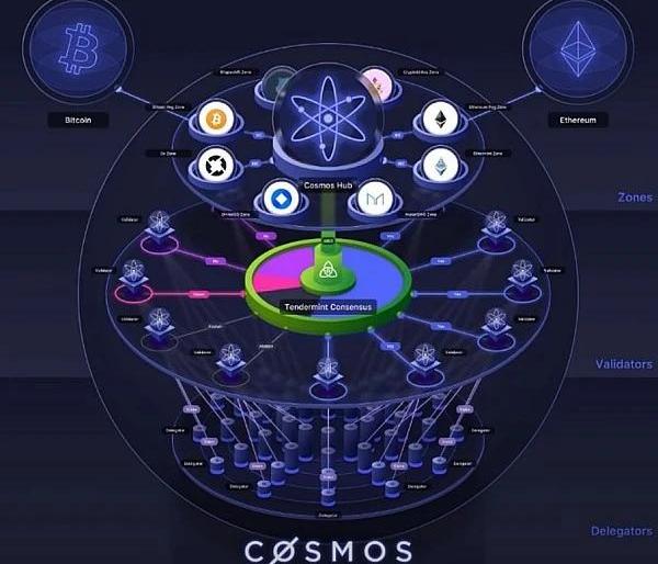 2.Cosmos的技术核心共识层–TendermintConsensus:首个互联网级别可用的BFT的共识协议,PoS,当前有150个活跃验证节点。开发层–Hub&Zone:CosmosHub作为整个系统的中心,为所有线上生态系统提供信息交互和交易记录与执行。而Zones则为Cosmos生态的参与个体,可以是其他公链或者Cosmos生态上开发的dApp。