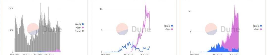 作者:刘全凯,吴说区块链OpenSea收购Gem是非常中心化的手段了,当有竞品冒出,尽管尚且还构不成威胁,垄断龙头企业仍会通过强大的资本实力迅速收购/兼并,将威胁扼杀在苗头之中。中国的游戏玩家应该非常熟悉,OpenSea的操作可以说和腾讯相当了。仍然值得称赞一下Gem.xyz,购物车、稀有度、flashbot、whales购买通报等功能非常好用,不仅可以节省手续费,还能时刻关注市场动态,在关键时候还能抢到稀有NFT。而这其中的很多功能也是社区一直希望OpenSea添加的,然后恶龙总听不见社区的声音,Gem的出现弥补了NFT市场功能上的空白。因此我们也笑称Gem是OpenSea的屠龙勇士。事实上,作为聚合器,Gem的相关数据很优秀。自去年12月中旬推出以来,Gem累积了超24.6万ETH的交易量,是更早推出的Genie交易量的两倍。Gem能在如此短的时间实现弯道超车,主要原因还是在于市场深度,Gem比Genie更早地聚合了更多的主流NFT市场,OpenSea、LooksRare、X2Y2等,而Genie在很长时间以来仍主要是OpenSea和其他一些小的市场,长时间的不作为让其失去市场份额,直至今年4月上旬才集成了LooksRare。另外,Gem还聚合了DuneAnalytics的分析数据表盘和自带防夹机器人,这亦是领先于Genie。Gem实现了对Genie的弯道超车。尽管数据很优秀,但NFT聚合器并不收取平台手续费等费用,仍在探索的盈利模式为被收购埋下种子。