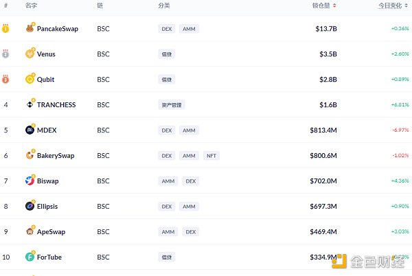 BSC链上DeFi锁定资产前十排名及锁仓量,数据来源:Debank