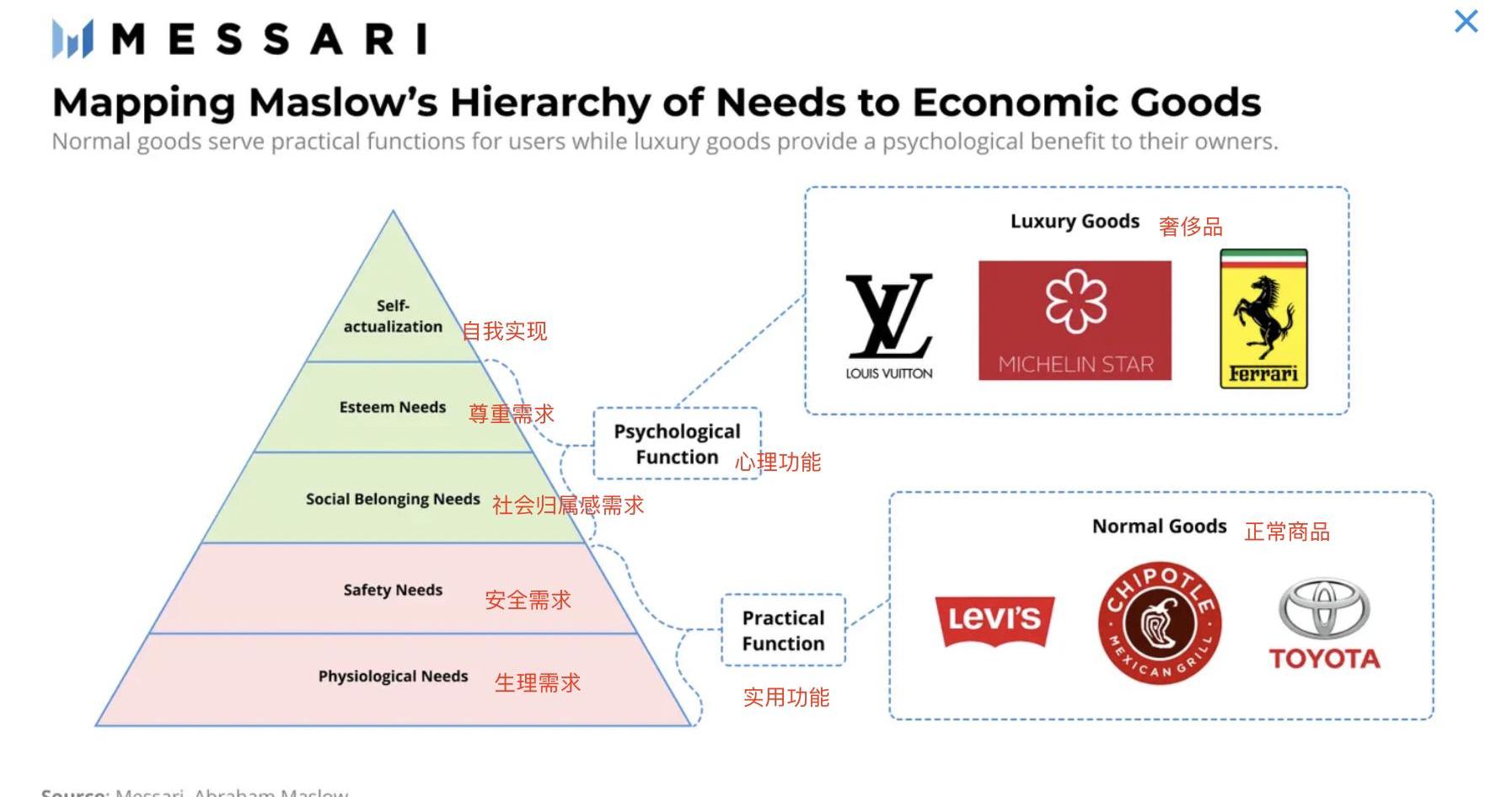 作为一种独特的数字商品,NFTs可以像实体商品一样发挥作用,同时满足实际需求和心理需求。虽然它们的实际使用案例仍在开发中,但其心理功能已经得到充分展示。NFTs在网络社区中为其所有者提供了一种社会归属感,当所有者在社交媒体上或在现实世界中把它们作为身份象征展示时,就能满足尊重需求。根据已故的DanielleAllérès的说法,奢侈品可以分为三个不同的层次:不可获得、中等和可获得。一般来说,不可获得的奢侈品是最昂贵或稀缺的,并最终成为消费者确定中间层和可获得层价值的起点。