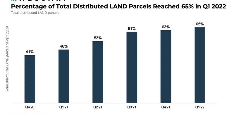 TheSandboxLAND的数量是有限的——166,464个地块。新的LAND地块需要进行初级销售,它们被出售给私人实体或通过拍卖出售。值得注意的是,65%的LAND地块已经被分配,比2021年第四季度增长2%。