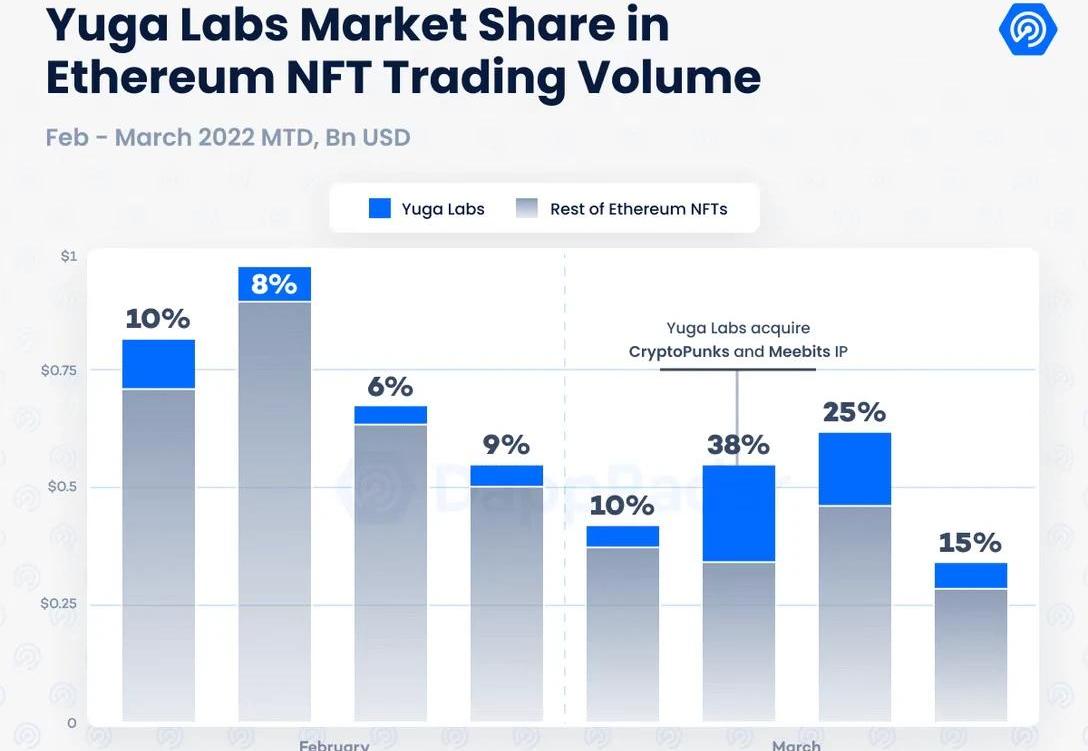 YugaLabs的收购积极影响了CryptoPunks和Meebits的市场需求。在他们宣布收购的第二天,这两个系列的交易量飙升了1000%。ApeCoin进一步推动了BAYCNFT市场的发展。重要的是,空投奖励与该品牌的NFT的持有比例成正比。在发布公告的一周内,YugaLabs的NFT交易量占以太坊NFT交易量的38%。该项目的NFT市场需求在接下来的一周仍然很高,尽管在过去几天开始下降。