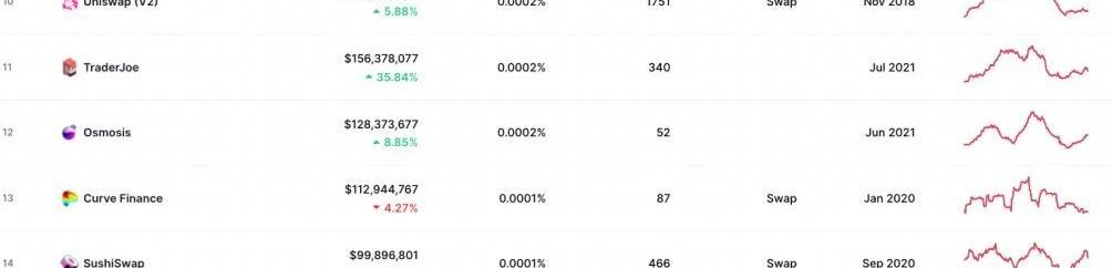 看起来比Uniswap少了不止一个档次。这一方面的原因是上面说的,关于EVM资产还没有上线y以及还没支持小狐狸,另一方面的原因,就是……你得看对手是谁,比如,按照coinmarketcap的Dex交易量排名,Osmosis超过Curve,sushi,排到了第12名。这对于一个上线不到一年的交易所,还是根植于非EVM结构链还不兼容小狐狸的DEX来说,很了不起了: