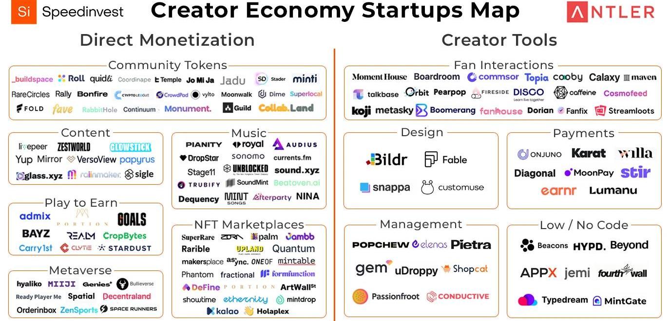 查看我们的创作者经济初创公司列表。这份榜单的目的既不是详尽无遗,也不是对初创企业进行排名,而是为了描绘快速发展和扩大的创造者经济初创企业生态系统。“新的创作者经济涵盖了创作者一直渴望的一切——所有权和社区主导的平台,所有社区成员的时间和贡献都会得到补偿。作为一个创造者是非常困难的。但是,我们相信每个人最终都会以某种身份成为创造者,”Antler全球社区经理OllieForsyth说。他继续说道,“我们很高兴看到这个领域在未来几年从游戏公司的各个方面如何发展,你不再需要在游戏中购买多个化身。您可以只拥有少数可以在多个平台上播放的内容。社区代币——基于我们的贡献而发行——可能会让我们中的许多人在未来拥有额外的收入来源——创造新一代财富。”如果您的公司不在地图上,而您想加入,请在推特上写信给我@VivoliPaola,我们会添加您!方法论