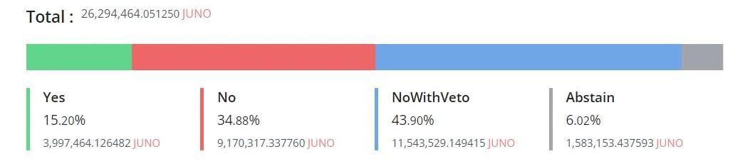 来源:mintscan.io之后Juno社区又先后发起18号、19号提案。18号提案就CCN问题提出折中解决方案:https://www.mintscan.io/juno/proposals/18投赞成票,“社区”和“CCN客户”之间平分所有JUNO,包括地址中的质押奖励。分配给JUNO的“社区部分”资金将用于智能合约,分配给JUNO的“CCN客户部分”将由CCN在20个月内以每月5%的费率分配给CCN客户地址。但18号提案遭到社区投票拒绝。投票结果分布如下: