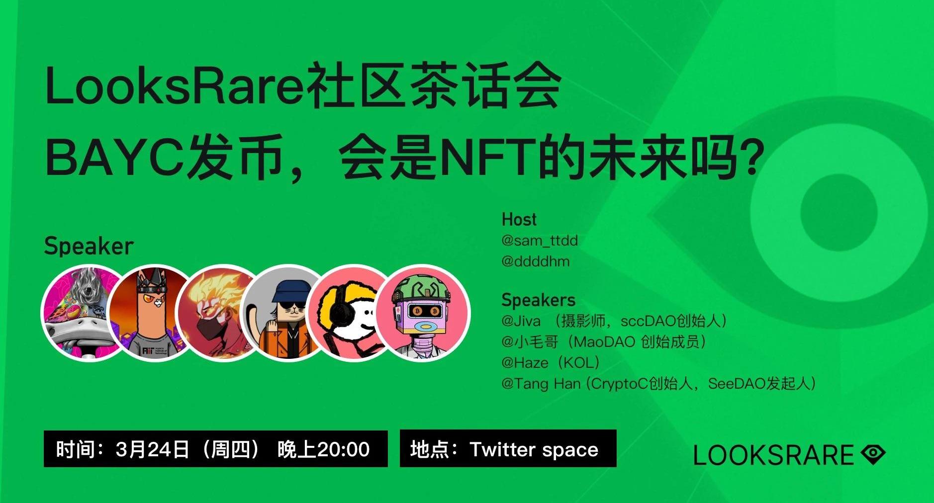 过去两周,NFT的高光时刻都是属于BoredApeYachtClub的。先是一举收购了cryptopunks和meebits,接着发行代币APE,并按照40亿美元的估值获得A16Z等头部投资机构的投资。BAYC是2021年4月底发行的,到现在还不满一年,但是,已经了从寂寂无名的新人到NFT龙头。这在LooksRare的交易数据上也得到充分体现。过去一周,在LooksRare上、MAYC)、以及BoredApe系列的交易量大增,达到12800ETH。在此期间,买家和卖家共获得的交易奖励为60万枚LOOKS,价值90万美元。LOOKS的质押者一共分得的平台手续费为260枚ETH,出售者一共节省的手续费为65ETH。BAYC为什么成功?APE又有何过人之处?BAYC的崛起,是统一“猿宇宙”,一家独大,还是开创新世界,带领NFT赛道一路向前?Looksrare中文社区于2022年3月24日晚上举行第二期茶话会,邀请了四位NFT资深玩家,对上述问题进行探讨。对话嘉宾包括:HAZE,江湖人称“鸡哥”,币圈老玩家,快速切入NFT领域;JIVA,昵称“关老师”,摄影师,sccDAO创始人;小毛哥,maoDAO创始人;唐晗,seeDAO创始人,BAYC空投上海半套房的小姐姐。