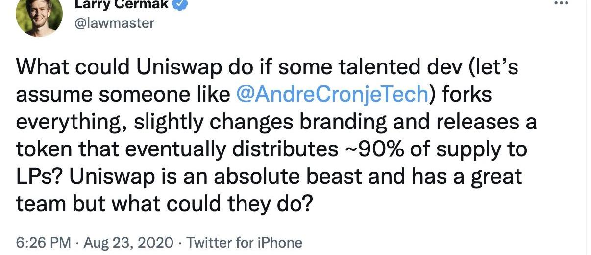 2020年3月的全球新冠疫情加重了市场恐慌,ETH的价格不到24小时大幅下跌逾30%。随之而来的夏天,UMA和Compound却开启了造富神话,拉开了DeFiSummer的序幕。七月,YearnFinance上线,AndreCronje向Yearn社区分发治理代币YFI,该代币通过流动性挖矿完全分配,这种模式赢得DeFi社区的大力支持,流入激励性流动资金池的资金锁定价值超过6亿美元。DeFi市场迅速崛起并脱颖而出,DeFi代币屡创新高,高额奖励吸引了一批批用户疯狂入场。此刻的LarryCermak可能不会想到,自己会成为加密货圈陈凯歌,一条推特代替了一个馒头引发了DEX的流动性”血案“。这场电影的第一个镜头始于LarryCermak2020年8月23日的一条推特,他设想若分叉Uniswap再能加上一个将90%的供应分配给LP的代币,会发生什么样的化学反应。