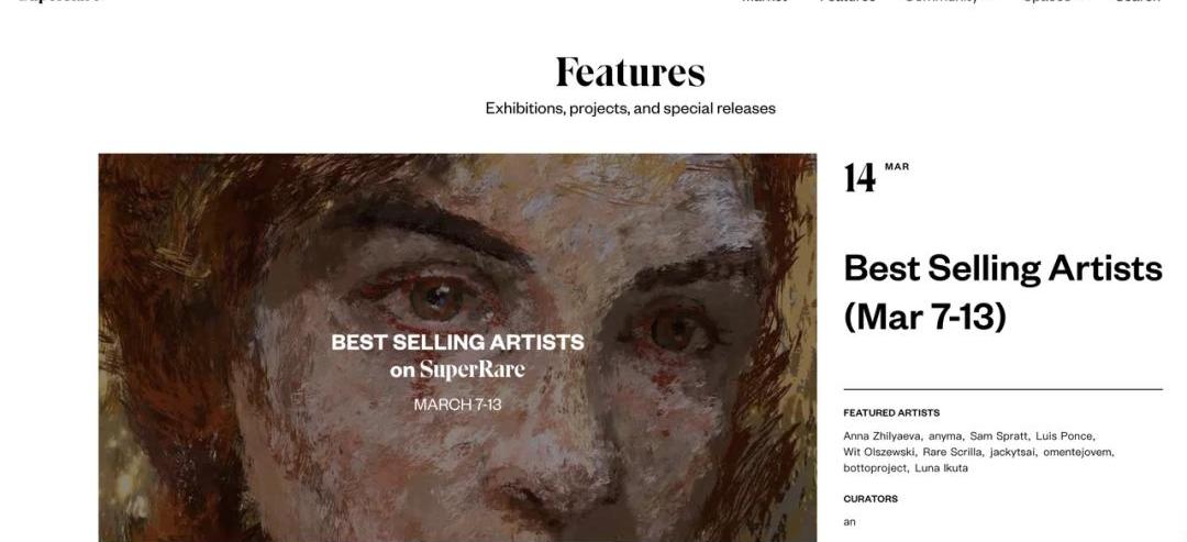 对于生成艺术的创作者,NFT交易平台的出现是另一个关键节点。在此之前,他们虽然在计算机上进行创作,但是在展示和出售作品时仍然需要将它们打印出来。在以太坊推出NFT的ERC721代币规范后,专为顶级艺术家打造的NFT交易平台在2017年陆续出现。只有受邀请的艺术家才能在SuperRare、NIftyGateway这样的平台发行作品,而生成艺术家正是被邀请入驻的主力军。