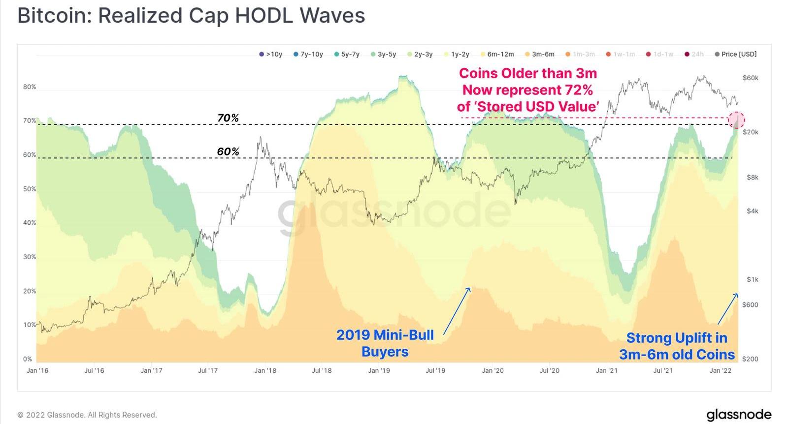 BTC&category=&date=1636502400&m=indicators.UtxoRealizedPriceDistributionAth&s=1582928693&u=1646000693&zoom=730\">实时图表转入当前市场,在这里我们可以看到,从11月开始均匀分布的供应大部分仍然存在。尽管有50%以上的回调,这些投资者仍未平仓。此外,主要的再分配似乎来自于那些在历史高点附近买入6万美元以上范围的投资者,他们已经在当前的3.5万美元至3.8万美元的价格区间找到了新的所有者。这种消费行为描述了一个由对价格不敏感的HODLers主导的市场,他们似乎不愿意清算他们的代币,即使处于亏损状态。同时,顶级买家已经被大量淘汰,与2021年5月至7月相比,他们在投资者群体中所占的比例要小得多。