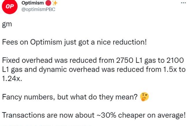在我们降低费用之前,固定开销参数被设置在2750gas每笔交易,费用比例系数被设置在1.5倍。后来对它们都做了一些调整:1.更低的开销结构:由于Optimism在去年11月11日进行了EVM等同性(EVMEquivalence)升级,提交Optimism交易batch至L1需要的gas变少了。实际开销减少了将近25%,从2750每笔交易降至2100gas每笔交易。2.从经验中学得什么:虽然现在Optimism仍处于十分早期的阶段,但自我们上线主网这几个月以来,我们知道我们有能力将额外费用从35%的利润率减少至10%的利润率(利润率=/L2收集的费用)。