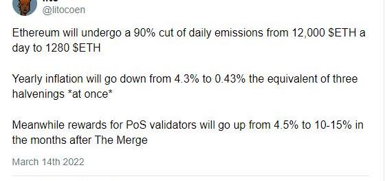 如果比特币减半真的是加密市场周期的原因,那么以太坊合并的意义将是巨大的。1、比特币减半将新的比特币供应量减少50%。2、以太坊合并将新的ETH供应减少了90%。合并被戏称为「三重减半」,因为比特币需要经历三次减半才能产生同等规模的供应减少。比特币需要12年才能完成以太坊在未来3个月内要做的事情。如果你相信比特币减半会引发牛市的观点,想象一下三重减半会发生什么。上一次比特币减半是在2020年5月,每个比特币区块奖励从每块12.5BTC变为每块6.25BTC。按比特币单价8,000美元计算,减半消除了比特币每天360万美元的抛售压力,这使价格更容易上涨。以太坊目前每天产出约12,000个ETH,或者说每天大约3000万美元的安全成本。以太坊合并后每日产出减少10,720ETH,同时还消除了每天的产出1,280ETH的抛压。由于质押者不需要消耗电力,因此他们不必出售他们的ETH收益。如果消除每日360万美元的BTC抛压足以触发牛市,那么消除每日2,700万美元至3,000万美元的ETH抛压会发生什么呢?