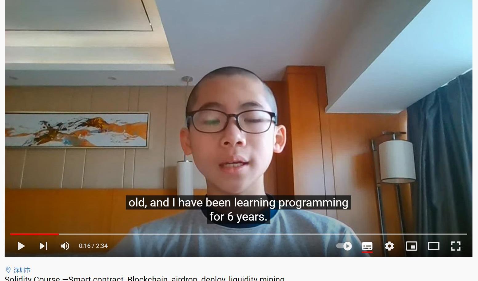 这名年幼的开发者并未止步于开发,甚至已经当上了教学者。不久前,一套智能合约教学视频在网上流传。而视频作者正是当下大火的TheRandomDAO创始人——HuangZheng。他是一名年仅12岁的智能合约开发者,目前正值小学生六年级在读,自称学习编程已六年。目前这一教程仍在持续更新,现已更新至第九节。而更为令人震惊的是,这位后浪开发者,甚至还制作了中英双语版本,录制了不同语言的两份教程。视频中,HuangZheng在Ethereum链上部署了一份智能合约。这个课程是基于他部署的这份智能合约的整个过程。课程将详细介绍智能合约的创建、部署、测试、空投、挖矿等内容。希望大家能从这个课程当中学会如何自己创建一份智能合约。