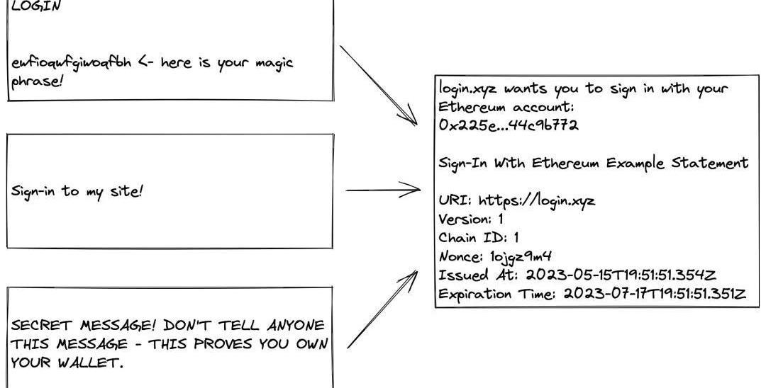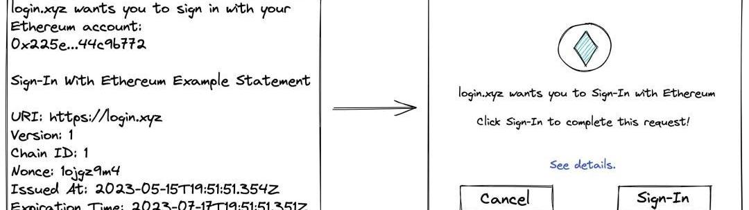 连接钱包后的第一步是给用户提供人类可读的消息,这样他们才能理解自己进行了什么交互。在很多案例中,用户看到的是"LOGIN"(登录)字样,或者一些让你登录的文字,甚至有时只是一个任意的数字(在这里,对这个随机的疯狂的字母和数字集合签名吧)。那么相反,我们可以根据现有实践确定一组必需的字段、设定好许多良好的安全措施和一个在人类可读和安全运行之间平衡的严格语法。此外,钱包不需要改变它们现有界面和实践,至少可以继续为用户提供这类信息。首先,我们可以接收所有这些混乱的「SIWE」信息,并以一种可接受的通用方式向用户提交请求: