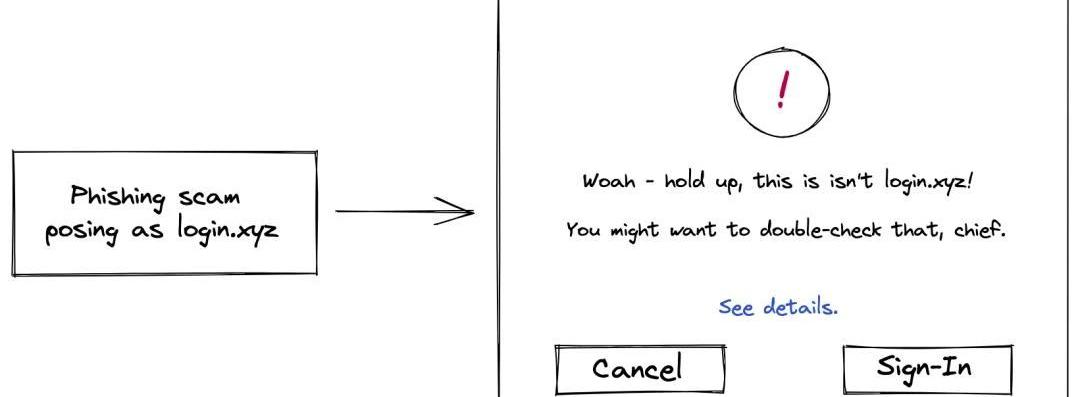 该规范还为钱包引入了额外的安全要求,例如引入域绑定以防止钓鱼攻击;引入nonces以防止重放攻击,用户在整个过程中得到了进一步的保护。比如,如果钱包发现一个有效的SIWE信息,但是用户正在对example.com进行签名(但实际上是在exampie.com),钱包可以警告用户该情况: