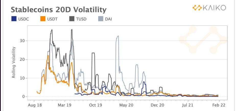 稳定币2021年是算法稳定币项目的一年。然而,大多数项目失败了。目前更多算法稳定币项目试图在抵押和算法之间找到一个最佳平衡点。由于市场波动,UST(Terra稳定币)在2021年出现了两次脱锚。最终,Terra团队通过与Solana和Cosmos等区块链连接,获得了足够的流动性。2022年,将出现更多像DAI和MIM这样的抵押稳定币。它们将自带一些附加功能,比如免费借贷。随着不同区块链之间更多的互操作性和互联性,一些稳定币可能会被淘汰。中国数字人民币正在被腾讯和阿里巴巴等科技巨头采用,并推动了金融集团的增长。微信也在采用数字人民币并提供客户端访问。问题在于,数字人民币是否会与去中心化应用程序集成以及如何集成。稳定币可以使加密货币成为日常交易的主流媒介,并应用于其它领域,如商品和服务交易、去中心化保险解决方案的发行、衍生品合约和消费贷款等。为了更好地发挥作用,稳定币必须保持其稳定性,而稳定币的波动性近年来也呈现显著下降。
