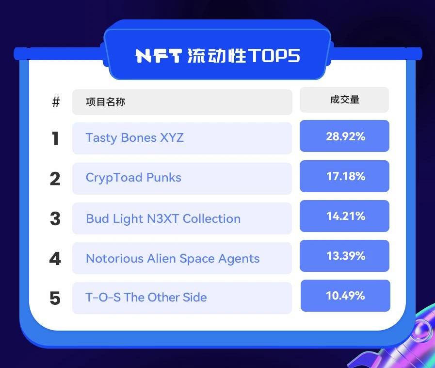 按过去24小时流动性指标,排名前五的项目分别为TastyBonesXYZ、CrypToadPunks、BudLightN3XTCollection、NotoriousAlienSpaceAgents和T-O-STheOtherSide。