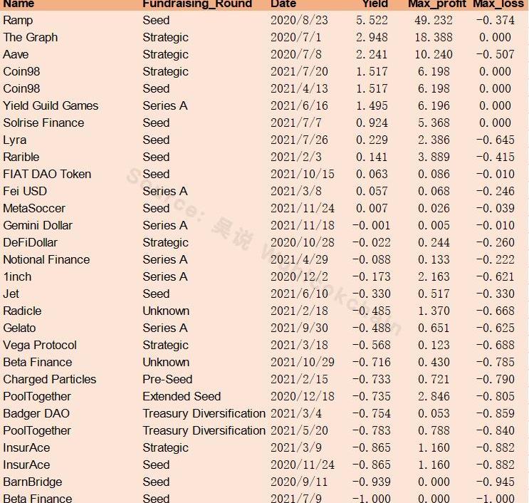 多数投资者喜欢追踪项目的融资信息,以此作为项目资质的评判标准。本文详细统计了自2020年7月以来的590个已发Token项目的融资信息,计算自融资信息公布以来的收益率、最大收益和最大亏损。从两个角度呈现VC对投资者的借鉴意义。第一,从VC角度出发,列举40家知名VC的投资情况,计算其损益。第二,从项目角度出发,筛选业绩表现较好的项目,挖掘其背后的VC。之所以不统计2020年7月以前的数据,是因为当时的融资信息比较凌乱,大部分都没有披露。本报告存在很大的局限性,需要读者注意:非常重要的一点是,项目token的损益不是从发行日开始算起,而是从融资信息公布日开始算。以AxieInfinity为例,该项目发行至今上涨了超过300倍,a16z与Paradigm等一众知名VC都参与了其B轮融资,但如果按发行以来的收益率计算就会高估他们的实际收益率。事实上,B轮融资是去年10月公布的,而Axie的暴涨发生在去年夏天,如果只计算10月以来收益率,那么真实数字为-50%。那么VC的真实收益率就是-50%?也不尽然!我们不知道他们的成本价,更不知道他们的退出价,也无法知道在不同项目的金额分配。因此用这种方式衡量VC的投资能力过于想当然了。本文计算的所有收益率均不代表VC投资业绩,只是衡量融资信息对于投资者的参考价值。部分项目存在多轮融资,上述590个项目共有685条融资数据。所有融资数据均来自DoveMetrics,价格数据均来自CoinGecko,数据截至2022年2月10日。此外需要注意的是,对于顶级VC来说,投资收益曲线拉长,例如它们在2020年7月以前投资的一些项目,也会在这之后获得高额回报,本文没有进行相关统计。知名VC40家VC按照投资信息公布以来的收益率排序: