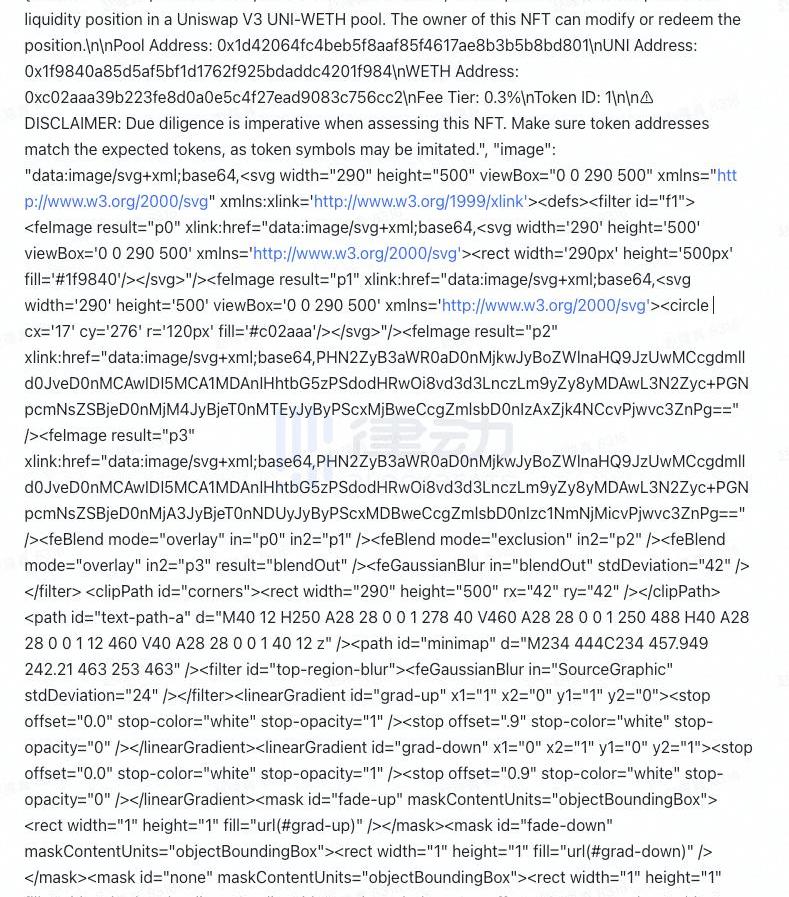 但是与图片类NFT不同的是,作为游戏中角色或道具的NFT,其主要价值并不来源于其能够在网页前端显示的图片,而是其在游戏中具有的功能和属性。比如一个NFT代表的游戏角色的攻击力越高,便越有可能在对战中取得胜利,因此其价值便越高。而这种NFT元数据中存储的信息,只是类似于一个游戏角色的皮肤,即使被修改也不会影响其游戏属性。这就类似在王者荣耀中,更换游戏角色皮肤不会对游戏的运行产生显著影响一样。因此在游戏中采用的NFT,更重要的是这个NFT在游戏中的实际功能,或者说是其内在价值,而不是表现在网页前端的皮肤属性。UniswapV3PositionNFTUniswapNFT元数据的存储方式极为独特,值得重点解读一下。我们还是先通过Etherscan查询一下链上数据,得到的返回结果如下: