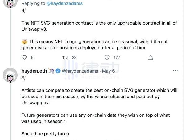 可以看到,在元数据的最前方标注了该做市头寸的代币对、做市价格区间、代币地址以及声明等信息。在后方的image字段内,保存的是以svg格式存储的NFT图像信息。这里稍微解释一下svg格式。svg是一种图片保存格式,其中文全称为「可缩放矢量图形」。我们知道,现在常用的图片保存格式是基于像素的,比如我们的手机照片保存格式,便是把镜头采集到的每个像素的颜色一个一个保存在文件内,因此像素越高图片就越清晰,同时所占用的存储空间也就越大,也越难以在链上保存。而svg格式并不是通过保存像素来存储图片,而是保存图形的形状。例如:保存一个长宽比为2:1的矩形,底色为红色,在左上角显示代币对的名称等等。这种存储图像方式的优点是,形状一旦确定便可以无限放大缩小,且其占用的存储空间不受图形大小影响,只与图形的复杂度有关。因此这种存储形式可以帮助在以太坊上低成本的存储结构较为简单的矢量图片。又由于Uniswap的NFT全部采用同一个矢量图模板,因此这个NFT的图片样式只需要在部署合约的时候存储一次,之后每个新铸造的NFT只用更新一下图形中的代币对等核心信息就可以生成新的NFT图片。因此用户并不需要为存储这个图片支付存储成本。Uniswap的NFT元数据存储方式,可以说是众多NFT项目中最让人眼前一亮的解决方案。他同时兼顾了几个重要的需求。一是全链上保存,具有完全的去中心化与不可篡改性;二是不依赖网页前端存储的缓存数据就可以直接从链上读取全部信息;三是不会涉及跨链调用数据的风险,不用担心采用链外存储的协议失效或被攻击,只要信任以太坊的安全性,便可以完全信任该NFT的安全性。四是可以保存较为复杂的图像,不像Autoglyphs项目那样只能显示简单的图形信息。当然谈了这么多,最后还是要回到NFT的价值来源问题。其实对于Uniswap的NFT价值来说,其元数据保存在哪里,甚至是不是保存了元数据,都完全不影响其价值。因为Uniswap的NFT的价值,只取决于其可以从资金池中取回资产的价值。就像你持有的银行存单,不论印刷质量是精美还是粗糙,只要能取回等值的货币,则存单本身美观与否完全无关紧要。最后再总结一下UniswapNFT的基本特点。Uniswap的NFT其前端显示图片是在以太坊链上存储,不可篡改但可以由团队进行后续升级。根据其创始人的介绍,存储元数据图像的合约是整个UniswapV3智能合约组中唯一可以进行后续升级的智能合约组件。但不论其后续图像如何改变,都不会影响其NFT的内在价值。
