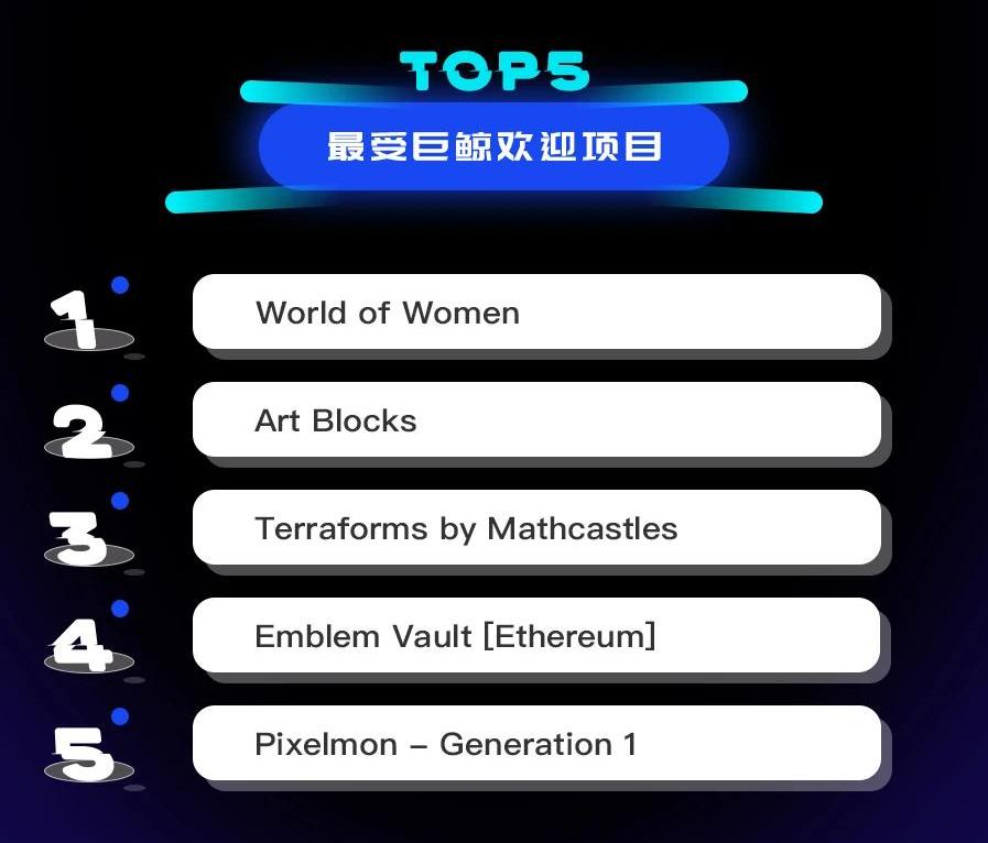 最受巨鲸欢迎项目排前五的分别是:WorldofWomen、ArtBlocks、TerraformsbyMathcastles、EmblemVault和Pixelmon-Generation1。