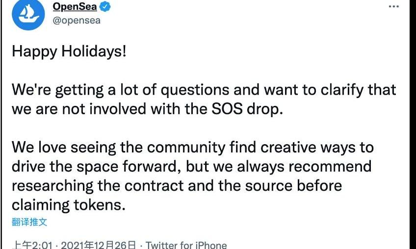 OpenSea会SOS发行的表态OpenSea的回应十分微妙,一方面肯定了社区作为,但言外之意也提示了非官方发币合约的安全问题。这一番发言也招致一众用户反感。有人发问并威胁道,「当你急于进一步集中并放弃Web3精神时,其他人奖励你的用户,你是什么感觉?如果你明年不为你的用户提供代币,那将是你的最后一年,谨慎选择你的行动。」也有人表示,「你不送,他们送了,等他们出了NFT平台,我还是去他们的平台交易吧,再见!」情绪一旦激起,市场就容易疯狂,这是加密资产市场过去一年里多次呈现的状态,DOGE在特斯拉创始人马斯克的喊单下出现价格狂飙是一个例证,ShibaInu要干掉狗狗币又是一次印证。至少有一个事实,OpenDAO的背景不明,官方推特在今年12月刚刚创建,面对这样一个项目,SOS的持有者或许该有一个自觉,盈亏自负,风险自担。也有网友在推特上提出对OpenDAO的安全性质疑。NFT社群Llamaverse创办人nftllama.eth提醒,最好做好研究,并承担风险,他指出OpenDAO是由「9x9x9」和其他大量人员参与,但不要只听信一个网红的言论。除此之外,OpenDAO以反对OpenSeaIPO为名发币,且未来计划中又有补充平台功能的承诺,如同替OpenSea发了一个币,这种行为的合法性也值得商榷。PUNKSComic的创始人Beanie就表示,人们对SOS的追捧「不可理喻」;CanaryCollection的联合创始人Osf发推文提出疑问,「SOS到底合不合法?我对声称随机空投代币持高度怀疑态度,你也应该如此,我希望任何人都不要在没有进行背景调查的情况下,随意参加空投。」已经有人发现,虽然「9x9x9」表示要拿出1亿美元支持SOS社区建设,但目前社区似乎已经出现恶意攻击行为,一些黑客开始通过机器人向Discord服务器发送附带恶意链接的垃圾邮件,参与OpenDAO项目空投的用户点开了这些链接,很可能会遭受资金被盗的风险。
