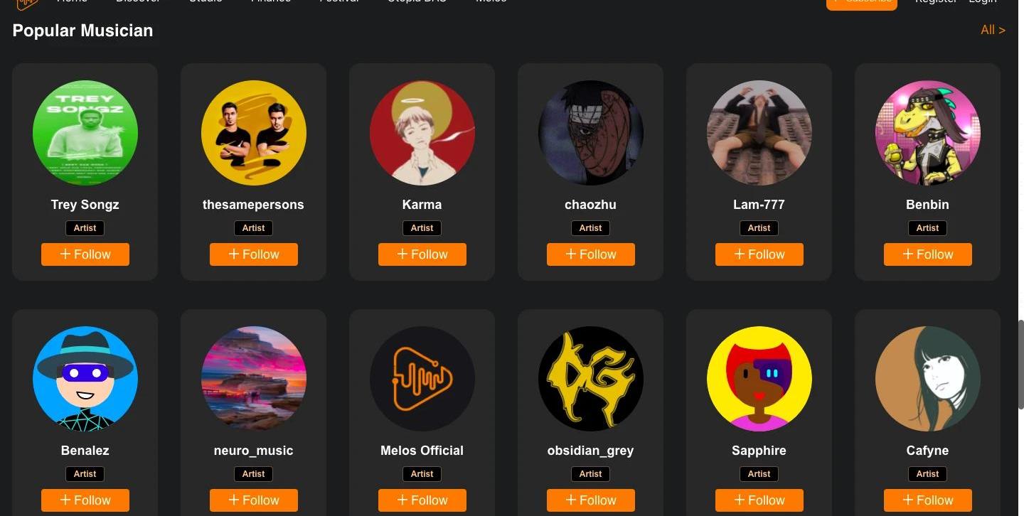 网站视觉:黑色系简约风简介:Web3.0音乐NFT平台,采用了DAO治理,使创作者能够通过NFTDNATree来获得灵感。MelosStudio建立了一个GitHub音乐创作流程,同时也作为一种社交联系方式,让音乐家和粉丝交流和分享音乐。融资:DapperLabs、Innovion、NGCVentures和MultichainCapital参与了MelosStudio之前的几轮融资。音乐人入驻: