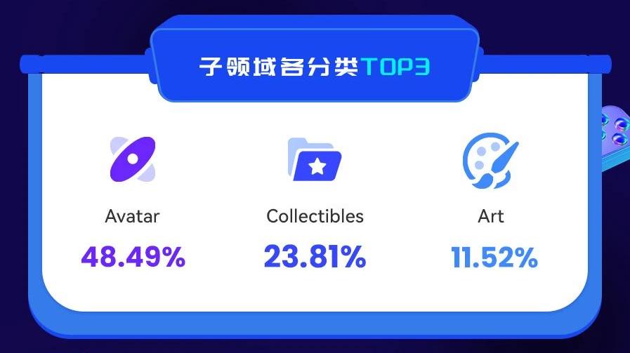 按市场占比,排前三的子领域分别为Avatar、Collectibles、Art。