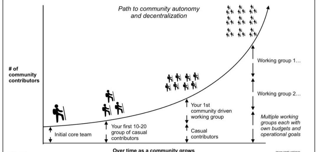 具有使命和愿景的核心成员。吸引最初的几十个早期贡献者。更多的人加入并衍生出第一个社区驱动的工作组。组织继续增长,专门的小组被创建。