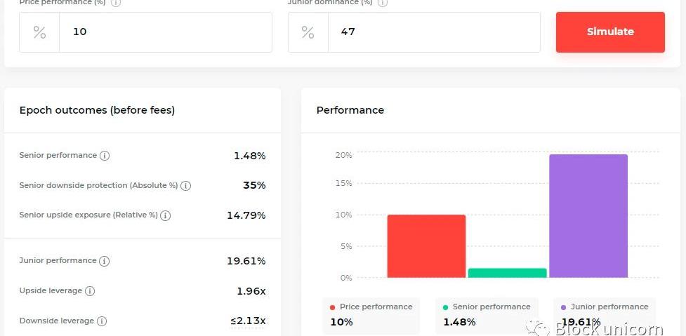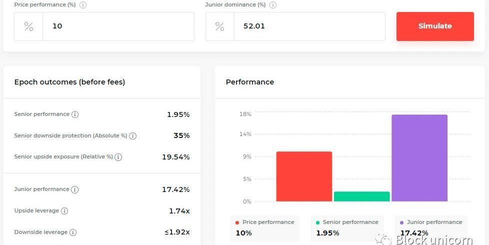 数据的关键点之一是底部的绿色/紫色条,突出显示了高级和初级百分比之间的差异。在Epoch5中,初级的主导地位徘徊在50%以上,与10月中旬的看涨情绪相对应。聪明的投资者可以使用两个池之间的分割作为更广泛的投资者情绪的基准。现在让我们模拟一下场景:>50%初级优势第一个场景使用52.01%作为初级优势,以保持事物与Epoch5中的现实生活情绪一致。假设在Epoch期间,ETH升值10%。在这种情况下,高级池中的投资者回报率为1.95%;初级投资者的回报率为17.42%。结果符合预期,因为高级持有人放弃了对初级方的投资回报。