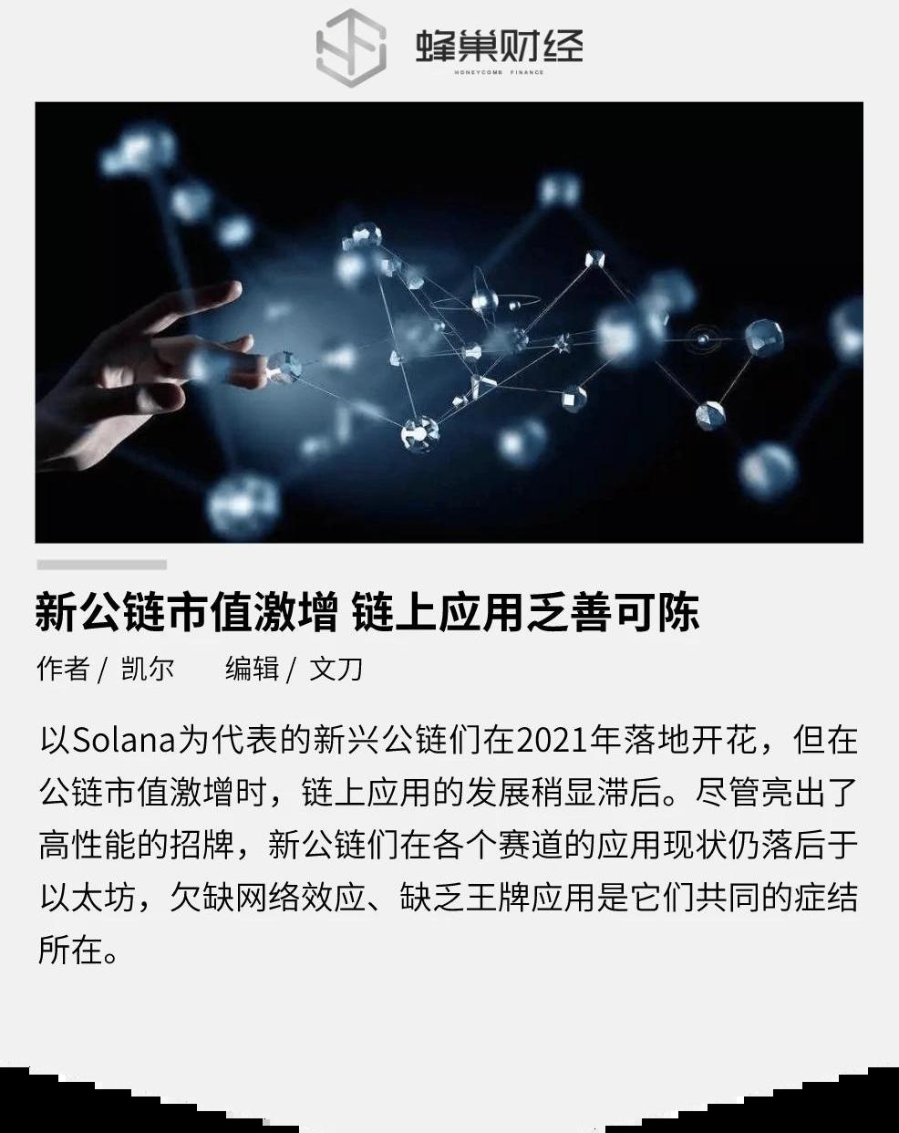 新生代公链们高举高性能大旗,链上应用却乏善可陈,这显得格外矛盾。而尽管当前以太坊TPS只有两位数,链上单笔交易Gas费也经常高达100美元以上,但它却始终是区块链链上应用创新的活力圣地。除了Uniswap、Aave等DeFi先驱性创新协议之外,以太坊在NFT、链上衍生品、DeFi2.0甚至极其依赖链上性能的GameFi等方面,都显示出首创、首发的特征。NFT方面,早期的以太坊上诞生了CryptoPunks,并在今年爆火;NFT概念流行起来后,以太坊上又出现了BoredApe、Loot等引领其他链上跟风的应用;衍生品方面,基于以太坊Layer2解决方案的dydx协议交易量一度超过Uniswap,交易体验可媲美中心化交易所;而近期以非锚定稳定币协议OlympusDAO和去中心化做市协议Tokemak为代表的DeFi2.0项目也是在以太坊上发源,随后在其他链上引发效仿;GameFi方面,AxieInfinity是这个领域的龙头,而它则是基于以太坊侧链RoninChain建立。问题来了。按理说,无论是DeFi、NFT还是GameFi,都需要链的高性能支撑,当市场上新诞生了那么多高性能、手续费低廉公链时,为什么创新型的流量型项目还屡屡出现在以太坊上?在投资公司MulticoinCapital联合创始人KyleSamani看来,以太坊最主要的优势在于网络效应最广,其链上包括全面的DeFi协议、开发工具、思维碰撞和Layer2等技术解决方案。「加密领域的所有人都在开发连通以太坊的桥梁,作为一个经济纽带。」无疑,以太坊庞大的网络效应得益于它长时间的积累,作为最早可以部署智能合约的公链,几乎所有的区块链开发者都是从以太坊开始入门,随着越来越多的王牌级应用脱颖而出,以太坊的区块链城池越建越大,也越来越繁华。有开发者曾举了一个形象的例子来描述以太坊与其他公链的区别。他说,以太坊就像是交通拥堵且物价高昂的大都市,在这些缺点之外,它更繁华、更便捷、更前卫、更有活力;新公链们则如同人烟稀少的乡镇或处于建设中的平原,除了不拥堵和物价低以外,很难再找到其他亮点。从新兴公链们的发展轨迹来看,它们正处于城市建设阶段,这里可能吸引许多开发者和用户,但在量级上很难与以太坊相提并论,因此无法挑战以太坊便不足为奇。在业内人士看来,打造网络效应是一个漫长的过程,需要新公链们先建立完善的基础设施,再加码创新,如果能够诞生Uniswap级别的王牌应用,可能会给链上生态带来质变,形成生态联动。「GameFi可能是新公链们的一个机会,它更需要性能支撑,而且这个领域还比较新,卷得没DeFi那么严重,用户也求新求快。」当前,Solana等新公链们正在加快链上城市的建设步伐,Avalanche、Fantom等网络都拿出数亿美元的资金作为生态激励,这有利于它们追赶以太坊的脚步。但市场仍需要对新兴公链抱以清晰的认识,在公链市值高企的情况下,链上生态发展如果不能跟上节奏,无异于空中楼阁,市值排名已从前五滑落至第45名的EOS就是前车之鉴。
