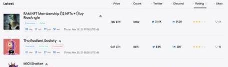 nftclick.io在Drops板块,默认将会展示当前日期往后的所有收录的NFT资产,用户挑选NFT资产的自由度更大,可以按照日期、公链、类别、风格、价格、数量、推特粉丝、Discord粉丝、评级、Likes等维度进行排序。其中,Rating评级将会是NFTCLICK独有的评分系统,影响项目最终评级的要素包括:创始团队、作品质量、经济模型、社交人气和Likes等。NFTCLICK团队会着重推荐Rating评级高的NFT项目,先人一步了解热门NFT资产。