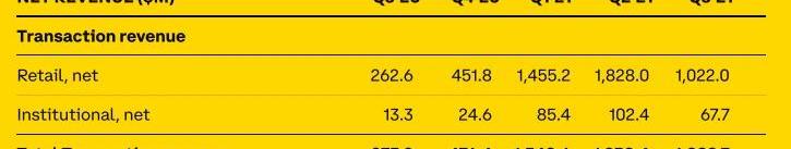 交易量的下滑,活跃用户的下降,都直接影响了Coinbase的收入情况。数据显示,三季度Coinbase总收入为13.1亿美元,净收入为12.3亿美元,营收主要分为两大部分:交易收入+「订阅和服务收入」。交易总收入为10.9亿美元,其中散户收入为10.22亿美元,环比下降44%;机构收入为6700万美元,环比下降34.3%,如下所示:
