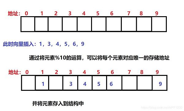 例: 现有 1 ,3,4,5,6,9几个数进行储存,将n%10求模运算的结果作为哈希地址进行元素插入。