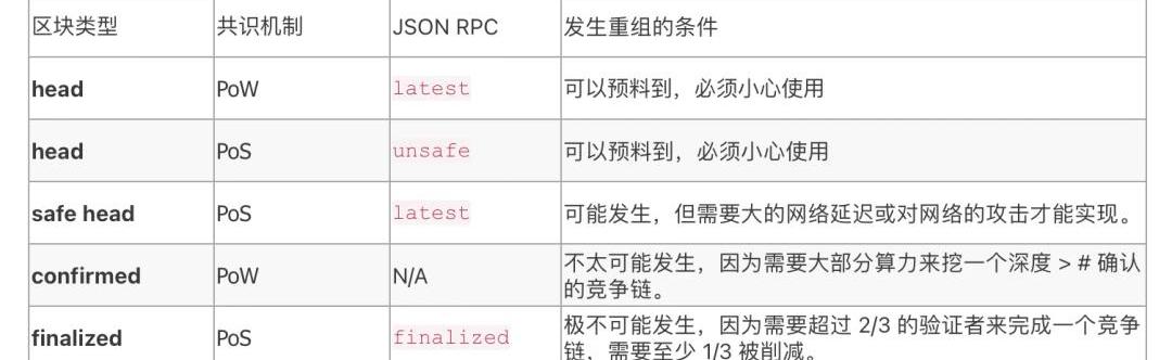 在PoW下,区块重组在一直都可能出现。应用通常会等待在新头区块上挖出几个区块,然后再将其视为该区块已不太可能从规范链中被删除,或已经得到“确认”。在合并之后,我们有了最终和安全的头部区块的概念。这些区块可以比“已确认”的PoW区块更可靠地使用,但需要改变理解才能正确使用。最终确定的区块是指被超过2/3的验证者接受为规范的区块。要创建一个冲突区块,攻击者必须至少销毁ETH总质押数量的1/3,在撰写本文时,这意味着超过100亿美元的ETH。安全头区块是指在正常网络条件下,我们希望包含在规范链中的区块。假设网络延迟小于4秒,大多数验证者都是诚实的,并且没有对分叉选择规则的攻击,那么safehead将永远不会成为孤儿块。此处提供了详细介绍如何在各种情况下计算safehead的演示文稿。此外,safehead的假设和保证将在即将发表的论文中得到正式定义和分析。合并后,执行层API在要求提供最新区块时将默认返回安全头。在正常的网络条件下,safehead和链的实际顶端将是等效的。与当前的PoW最新区块相比,safehead不太可能被重组。为了公开PoW链的实际提示,将向JSONRPC添加一个unsafe标志。最终区块也将通过JSONRPC公开,通过一个新的finalized标志。然后,这些可以作为PoW证明的更强大的替代品。下表总结了这一点:区块类型共识机制JSONRPC发生重组的条件headPoWlatest可以预料到,必须小心使用headPoSunsafe可以预料到,必须小心使用safeheadPoSlatest可能发生,但需要大的网络延迟或对网络的攻击才能实现。confirmedPoWN/A不太可能发生,因为需要大部分算力来挖一个深度>#确认的竞争链。finalizedPoSfinalized极不可能发生,因为需要超过2/3的验证者来完成一个竞争链,需要至少1/3被削减。